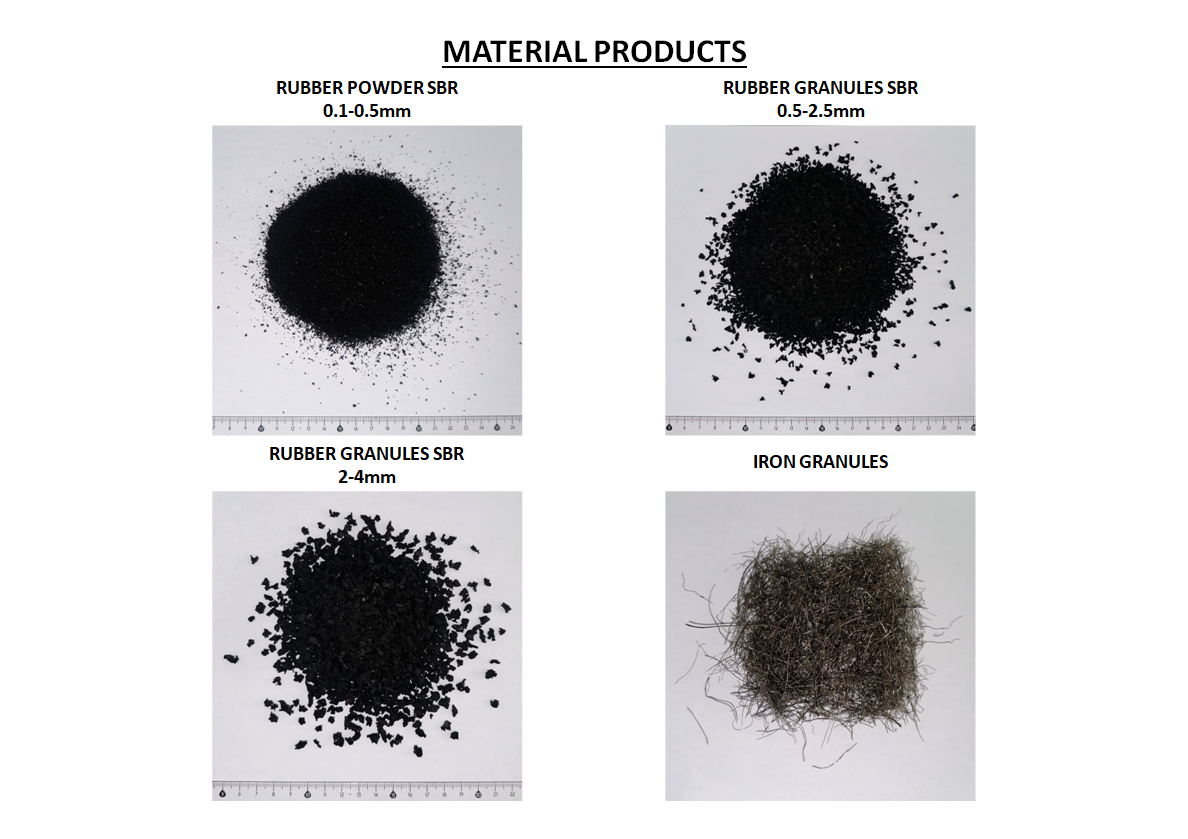 Παράλληλα εξειδικεύεται στην παραγωγή ποιοτικών προϊόντων όπως τρίμμα και πούδρα ελαστικού SBR σε διάφορες κοκκομετρίες (από 0,1mm εώς 4mm), διαθέσιμα σε μεγασάκους.